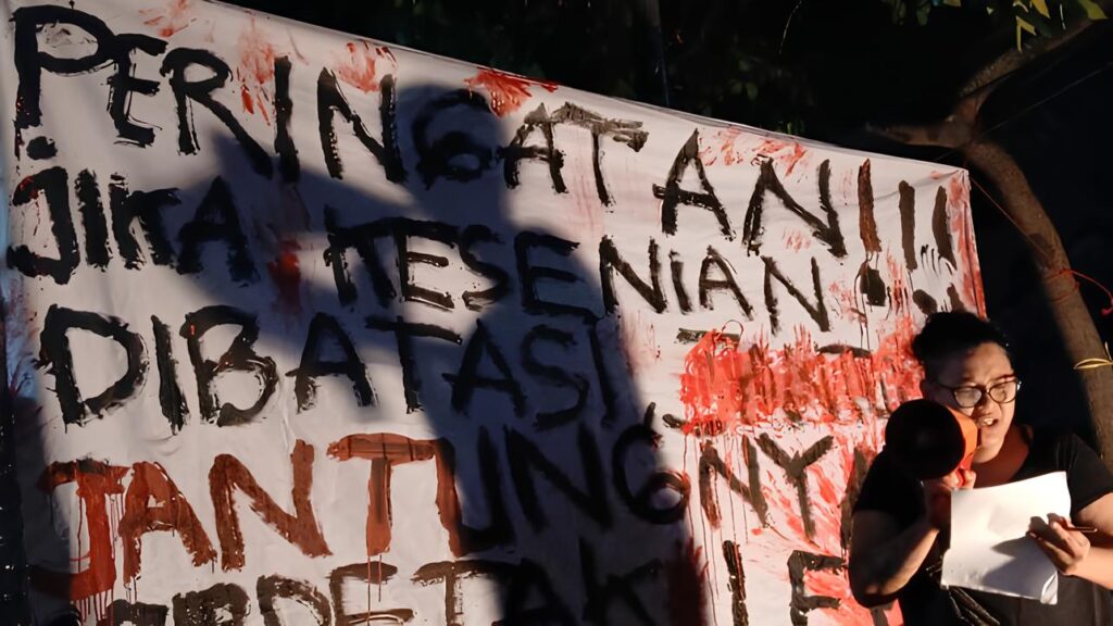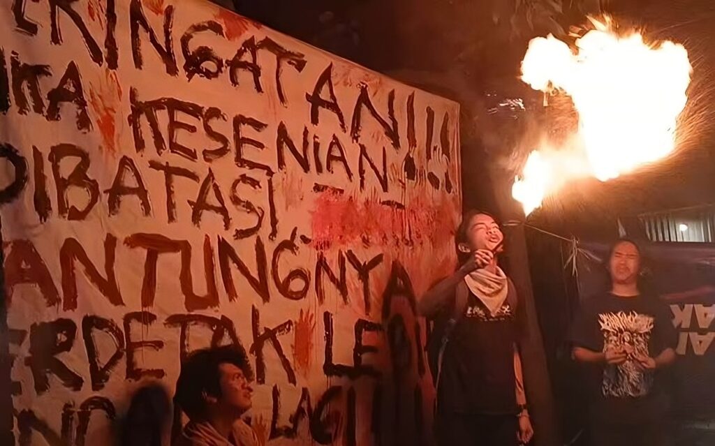Atraksi semburan api oleh salah satu partisipan aksi dalam acara Mimbar Bebas yang digelar oleh Aliansi Mahasiswa ISBI Bandung di pada Rabu 19/02/2025 (Foto: M.Haikal.A.A/LPM Daunjati)