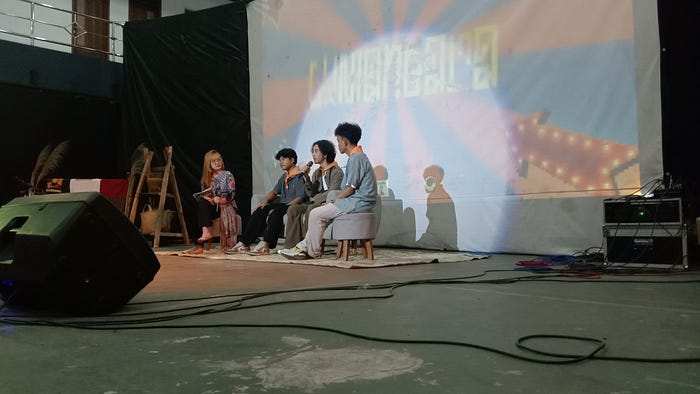 Sesi diskusi kedua bersama para sutradara. Duduk di tengah dari kiri ke kanan (Purwapaksi, Felix Saputra Hafiz, dan Muhammad Zakiyatul Qolbi). Minggu, 23 November 2025. GOS Patanjala ISBI Bandung. (Foto: Purwa Sundani/LPM Daunjati).