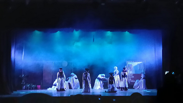 Tirai panggung terbuka di tengah sorot kabut biru diiringi alunan nada alat musik karinding dan bunyi gong . Sekelompok penari perempuan, di tengah sorot kabut lampu biru, mengenakan toga, memenuhi panggung sambil berteriak lirih: “Mereka menertawakanku!”