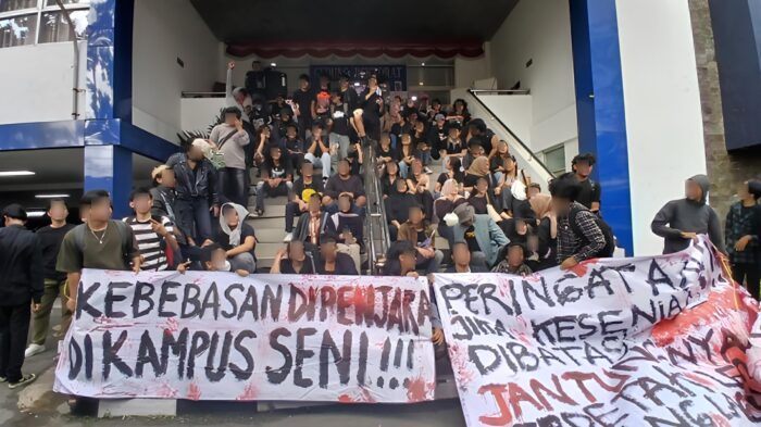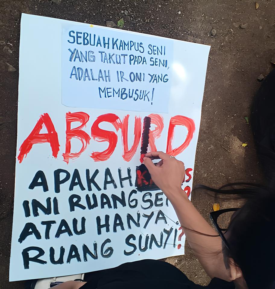 Hal ini memicu keresahan di kalangan mahasiswa ISBI Bandung, yang kemudian mereka suarakan dalam bentuk demonstrasi. Spanduk dengan pesan khusus dipajang di lingkungan kampus, diantaranya bertuliskan “Kebebasan dipenjara di kampus seni” serta berbagai pernyataan lain yang menggambarkan kekecewaan mahasiswa terhadap kondisi yang mereka hadapi. Demonstrasi ini diawali dengan para mahasiswa menuangkan kegelisahan mereka dalam spanduk bertuliskan “Sebuah kampus seni yang takut pada seni adalah ironi yang membusuk” dan “Demokrasi dan seni mempunyai nafas sendiri”. Tulisan-tulisan ini menjadi simbol protes terhadap apa yang mereka anggap sebagai bentuk pembungkaman ekspresi di institusi seni yang seharusnya menjadi ruang bebas dalam berekspresi.