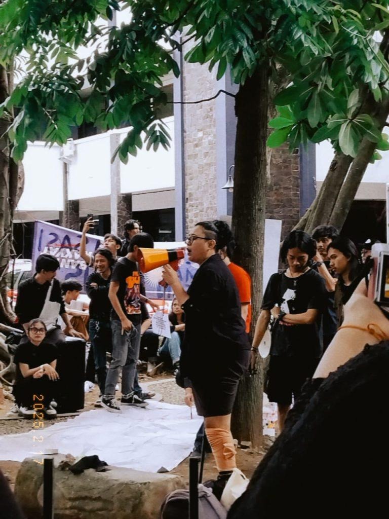 Kegiatan orasi pada saat demonstrasi, Taman Buaya, ISBI Bandung, Senin, 17 Februari 2025 (Foto: Dewi Rosaria Indah/LPM Daunjati)
