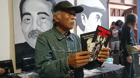 Rachman Sabur dengan buku “Teks-Teks Monolog Rachman Sabur” dan pamflet “Wawancara dengan Mulyono” pada 15/02/2025 (Foto:M.Haikal.A.A/LPM Daunjati)