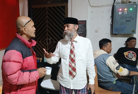 Tony ‘Broer’ Supartono berbincang dengan salah satu pengunjung (kiri) dengan latar Studio Teater yang digembok oleh pihak Kampus ISBI Bandung , nampak pula Iman Soleh, dosen dan pendiri kelompok teater Celah Celah Langit (sebelah kanan), turut menghadiri acara “Wawancara dengan Mulyono” pada 15/02/2025 (Foto: M.Haikal.A.A/LPM Daunjati)