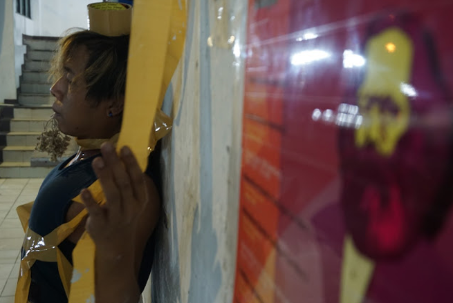 Tubuh kedua performer, menjadi tubuh darurat pasca-konflik dimana motif gerak semuanya bersumber dari pengalaman bentrok antara mahasiswa dan ormas FPI, dan apa yang tersisa setelahnya bisa menjadi gerak yang berulang (mengepal,mengeras), diamplifikasi menjadi sangat-mengepal, sangat-mengeras, tetapi juga pada peristiwa performance art, visi gerak bisa menjadi sangat berlawanan dari apa yang menstimulasi. Pada tubuh Semi Ikra Anggara, resepsi atas penyerangan FPI, justru dihadapkan pada tubuhnya langsung, menjadi objek atas dan untuk kemarahan, dimana seluruh tanah dan kotoran yang terperas di wadah ember seluruhnya dibanjurkan kepada tubuhnya sendiri, dimana posisi tubuh menjadi sejajar dengan tong sampah, baju, buku, jam tangan, lap pel, dan ember, sebuah sikap berdiam dari seluruh kewajiban membersihkan diri, ataupun pada tubuh terikat John Heryanto yang dililiti oleh lakbandan selotip di sekujur tubuhnya. Tubuh John Heryanto seperti juga posisi sejajar tubuh Semi Ikra Anggara dengan benda-benda found-object/mine-object juga menjadi sejajar bagi aksara 1965-2016 yang dituliskan oleh Semi Ikra Anggara, juga poster Sekolah Marx di samping kepalanya yang baru saja diintervensi oleh Organisasi Masyarakat bernama Front Pembela Islam, ulta-paranoid yang mengatas namakan Islam sebagai entitas yang harus dibela, logika yang sekaligus membendakan islam itu sendiri sebagai jenis material yang bendawi dan sangat fisikal. Menjelang satu jam performance, John Heryanto masih berdiam di dinding, hanya saja satu persatu tubuhnya seakan hendak berjatuhan dari dinding seiring dengan selotip yang pelan-pelan berlepasan.
