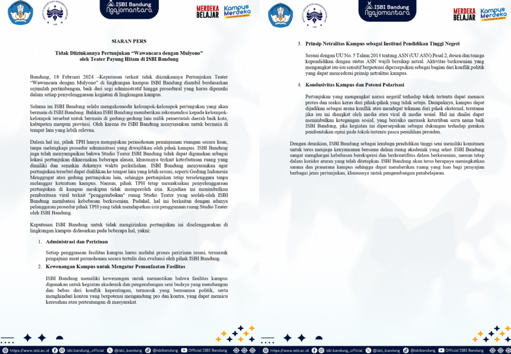 Sebagai buntut dari pelarangan pementasan “Wawancara dengan Mulyono” di Studio Teater ISBI Bandung pada Sabtu, 15 Februari 2025, lembaga ISBI Bandung melakukan konferensi pers di Gedung Rektorat Lantai 4 pada Selasa, 18 Februari 2025. Juru bicara konferensi pers dari pihak ISBI Bandung adalah Dr. Retno Dwimarwati, S. Sen., M. Hum. (Rektor ISBI Bandung), Indra Ridwan, S.Sos., M.Sn., M.A., Ph.D (Wakil Rektor Bidang Akademik & Kemahasiswaan), dan Dr. Supriatna, S.Sn., M.Sn. (Wakil Bidang Kerja Sama, Hubungan Masyarakat & Sistem Informasi) yang dimoderatori oleh Iip Sarip Hidayana, S.Sn, M.Sn.