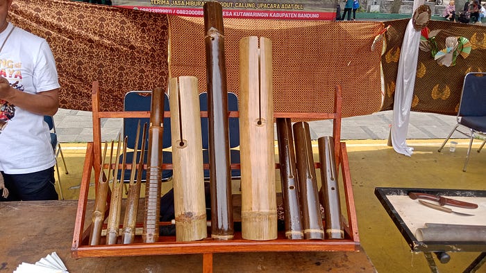 Seperangkat alat musik Goong Lonjor yang terdiri dari bangkong reang dan Goong Lonjor (tengah) itu sendiri. Alun-alun Soreang, Kab. Bandung. Sabtu, 13/12/2025. (Foto: Purwa Sundani/LPM Daunjati)