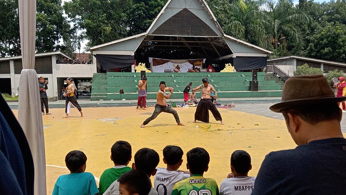 Sesi pertunjukan Debus dalam rangkaian acara TARITA di Alun-alun Soreang, Kab. Bandung. terlihat anak-anak antusias melihat pertunjukan Debus. Sabtu, 13/12/2025. (Foto: Purwa Sundani/LPM Daunjati)